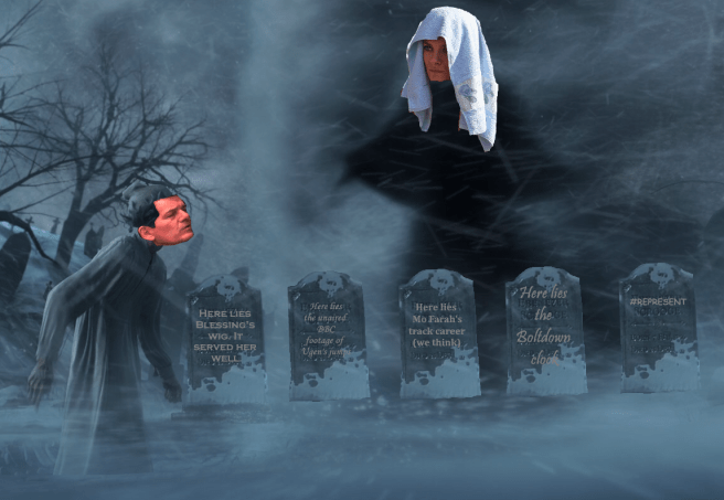 He moved onto the next. “Here lies the unaired BBC footage of Lorraine Ugen’s jumps.”